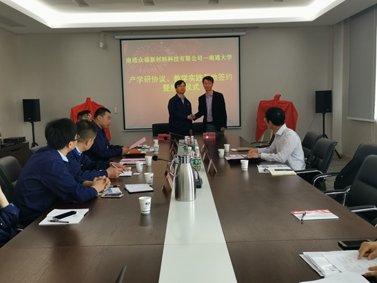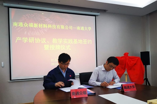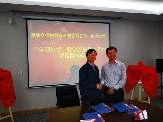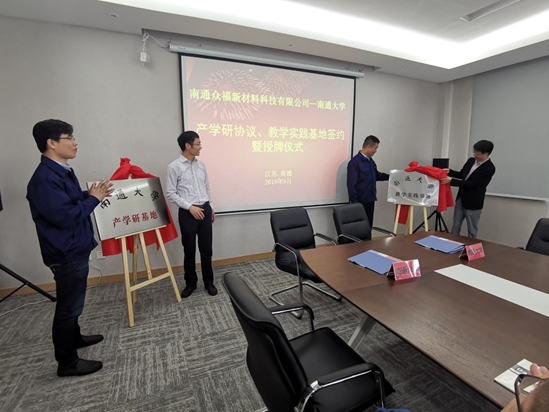 5月18日上午,南通众福新材料科技有限公司与南通大学举行产学研合产学研协议和教学实践基地签约暨授牌仪式。南通大学机械学院副院长张福豹教授及总经理张明亮为南通大学产学研基地揭牌。机械工程系副主任季彬彬副教授及生产经理朱建群为南通大学教学实践基地揭牌。
