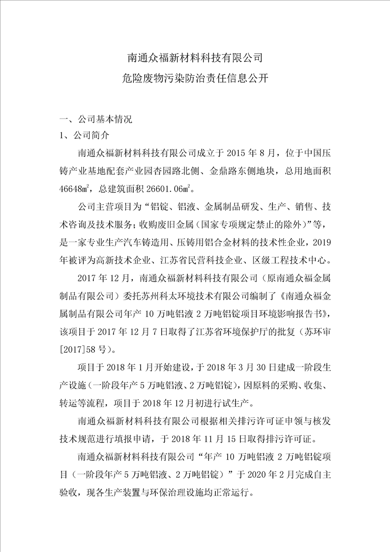 南通众福新材料科技有限公司危险废物污染防治责任信息公开